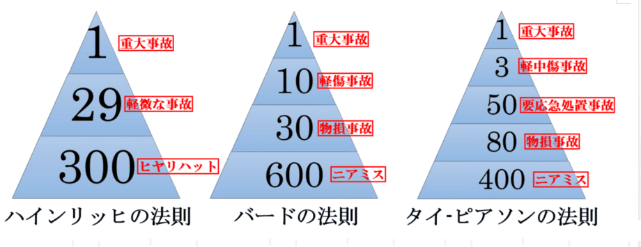 1つの重大事故の背後には、29の軽微な事故があり、その背景には、300のヒヤリハット(異常) が存在するという法則です。